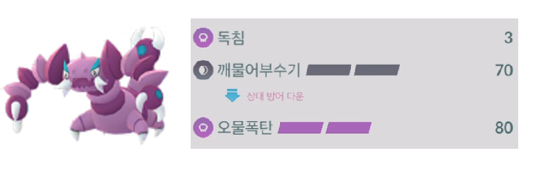 나는 이제 얘 없으면 파티를 못 꾸릴 정도로 자리 잡은 포켓몬이다. 파티의 허리 역할을 너무 잘해줘서 든든한 에이스 포켓몬. 아쿠아테일은 매일 생각나지만 깨물어 부수기, 오물 폭탄 둘 중 뭔가 하나를 뺄 수가 없기에 그대로 출전